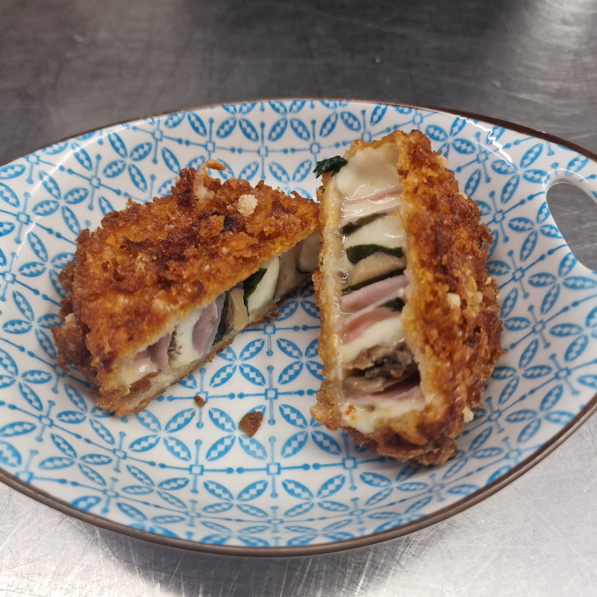 Sfoglia di provola affumicata arrotolata, farcita con salsiccia e friarielli, impanata ai cornflakes e fritta.
