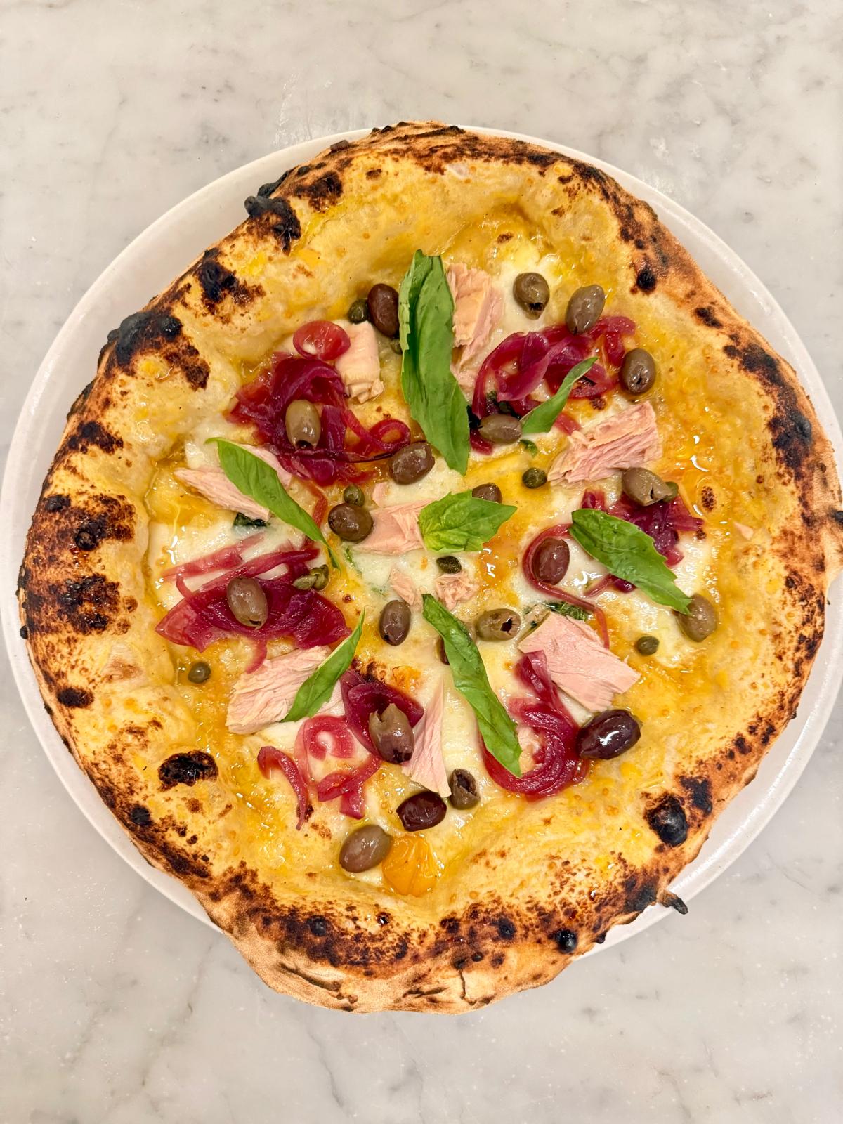 Fior di latte d'Agerola, crema di pomodorino giallo, cipolla caramellata, filetti di tonno all'olio d'oliva "Armatore", olive nere Caiazzane, origano, basilico e olio Evo.